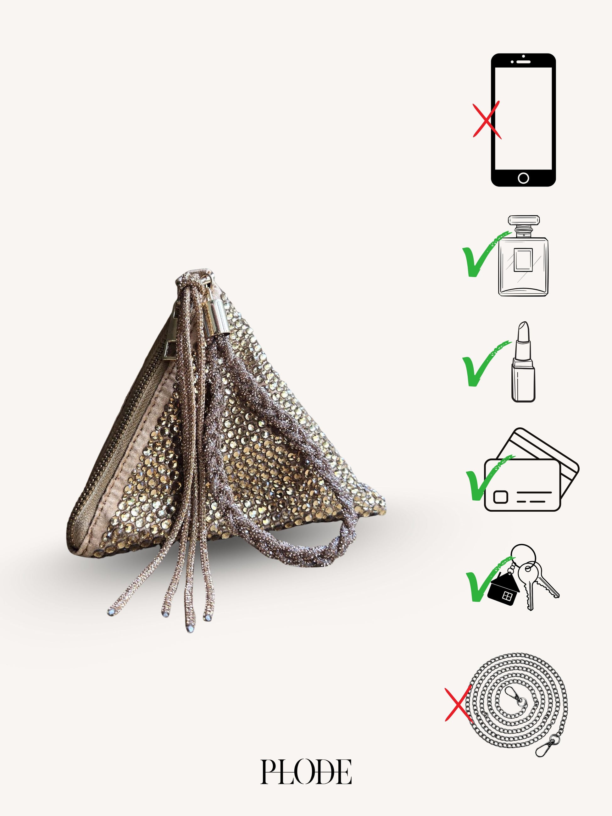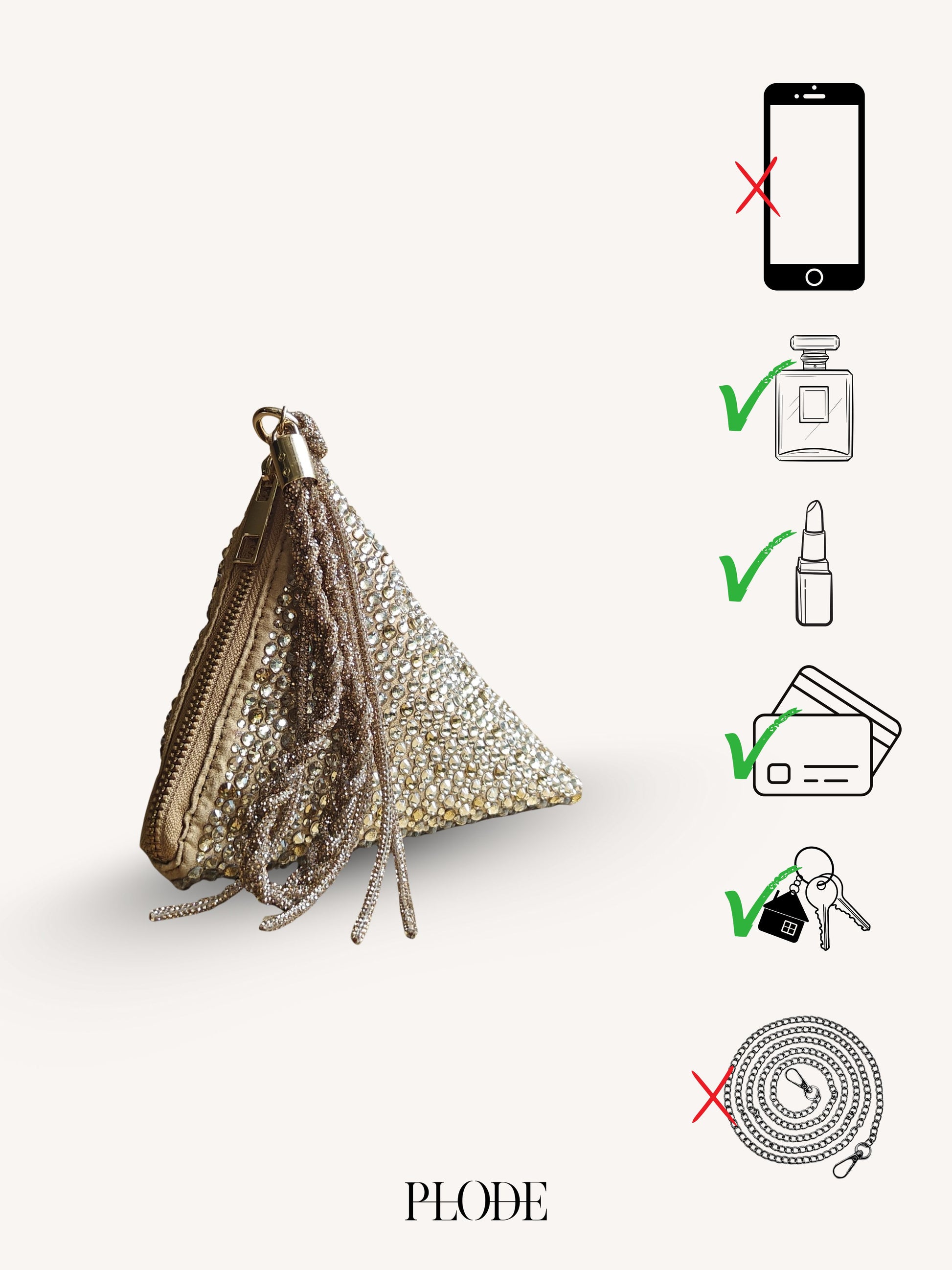 Introducing "Delhi" – our bold, new mini triangle bag, perfect for the stylish, adventurous woman who's unafraid to go all out and shine bright! This dazzling piece is embroidered with Swarovski crystals and features a striking rhinestone strap.