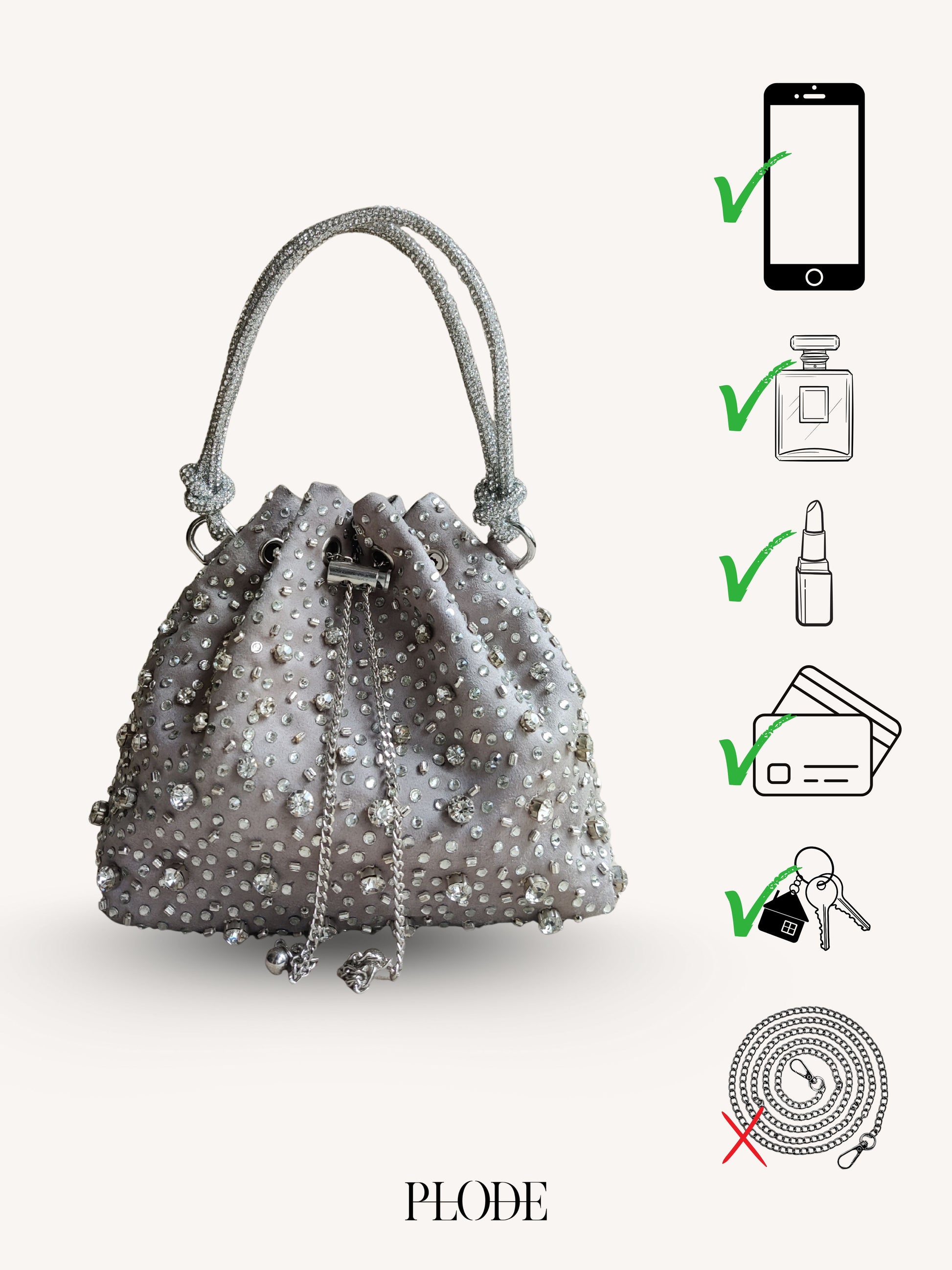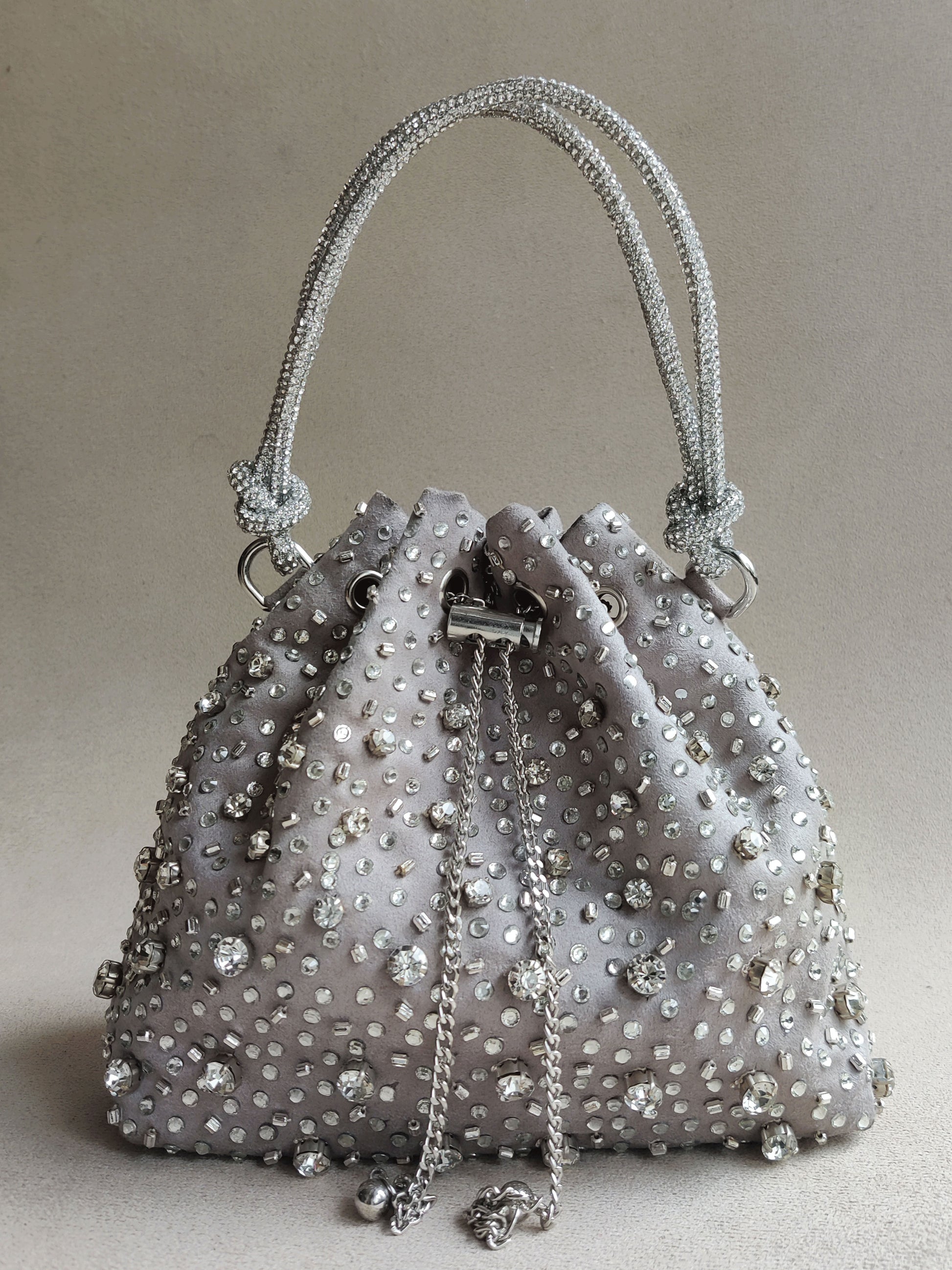 Inspired by starry nights, the bucket bag is definitely a show stopper. Embellished using a mix of Rhinestones and Austrian crystals, this bag is perfect to style with your Ethnic or Western Wear. Your ultimate bling bag!